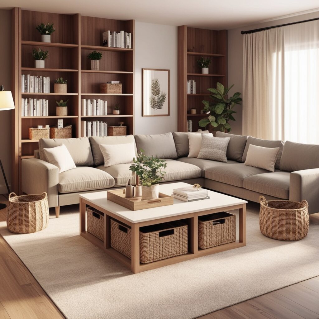 Sofás com baús, mesas de centro com gavetas e racks com portas ajudam a manter a bagunça fora de vista. Esses móveis multifuncionais são ótimos para quem deseja praticidade sem comprometer a estética.