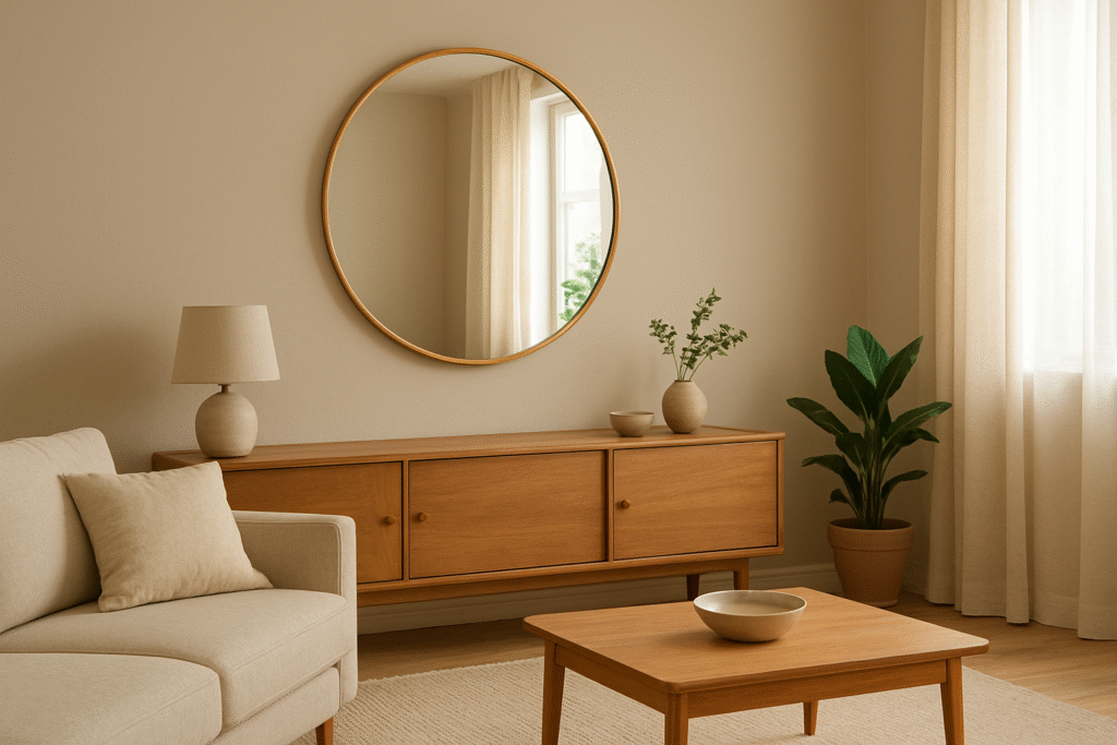 Um espelho grande com moldura diferenciada pode ser o destaque de um ambiente. Seja redondo, retangular ou em formatos geométricos, ele funciona como peça decorativa central.