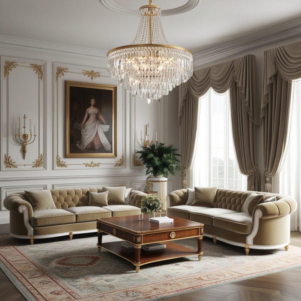 Móveis clássicos costumam ter linhas curvas, pés trabalhados e acabamento de alta qualidade. Sofás com estofados nobres, cadeiras de encosto alto e mesas de madeira maciça são comuns nesse estilo.