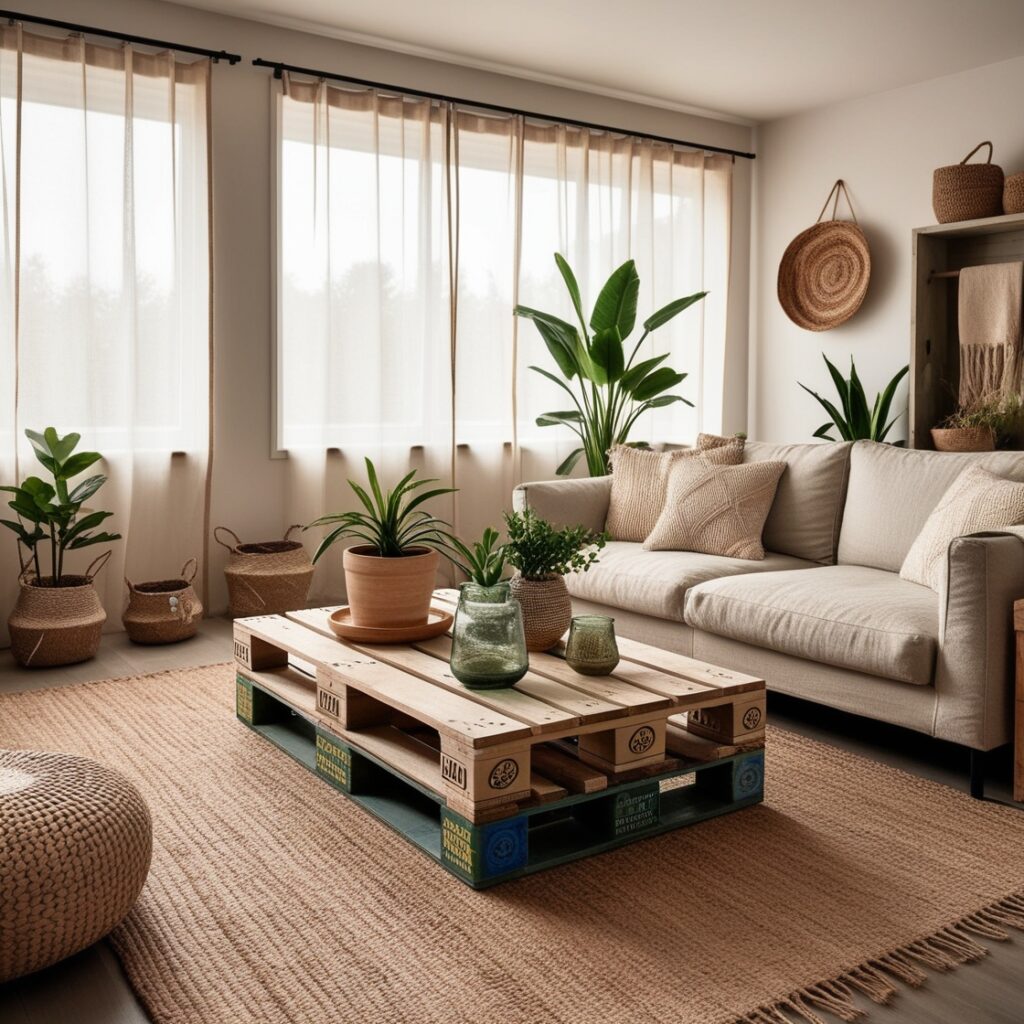 Uma das principais bases da decoração sustentável é dar uma nova vida a objetos que seriam descartados. Pallets podem virar sofás, mesas ou cabeceiras; caixotes de feira podem se transformar em prateleiras; e vidros de conserva podem ser usados como vasos ou porta-utensílios.